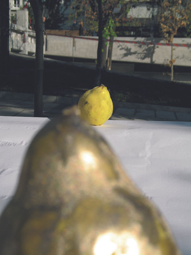 Działanie w przestrzeni miejskiej, skwer Kolonaki w Atenach, Grecja. Prezentacja miała miejsce w znaczącym czasie, w dzień Wigilii Bożego Narodzenia. Materiały: papier, gruszki, złota farba. Praca powstała podczas pobytu stypendialnego Erasmus-Socrates - studia w Ateńskiej Akademii Sztuk Pięknych w Grecji, 2004-2005.